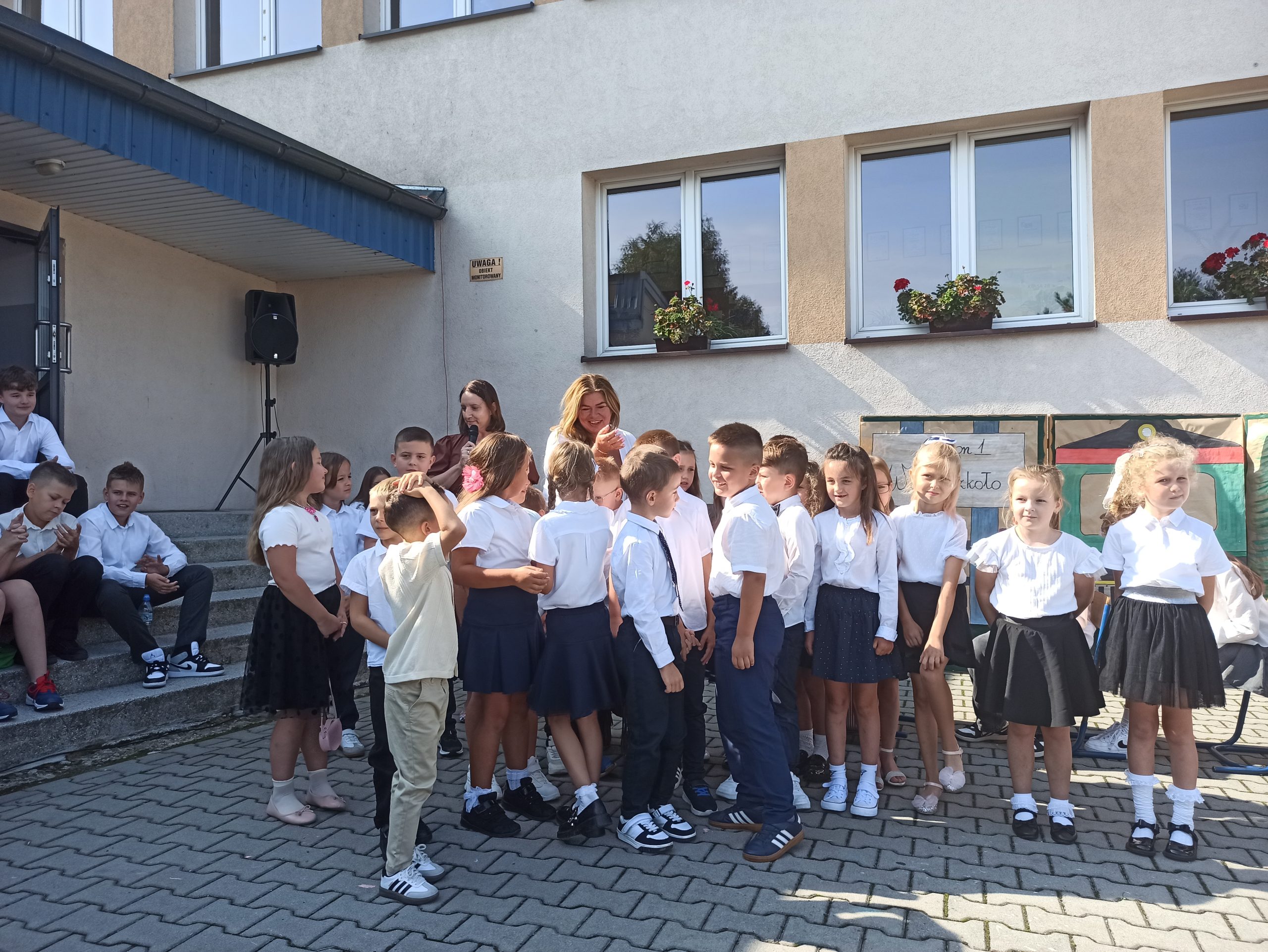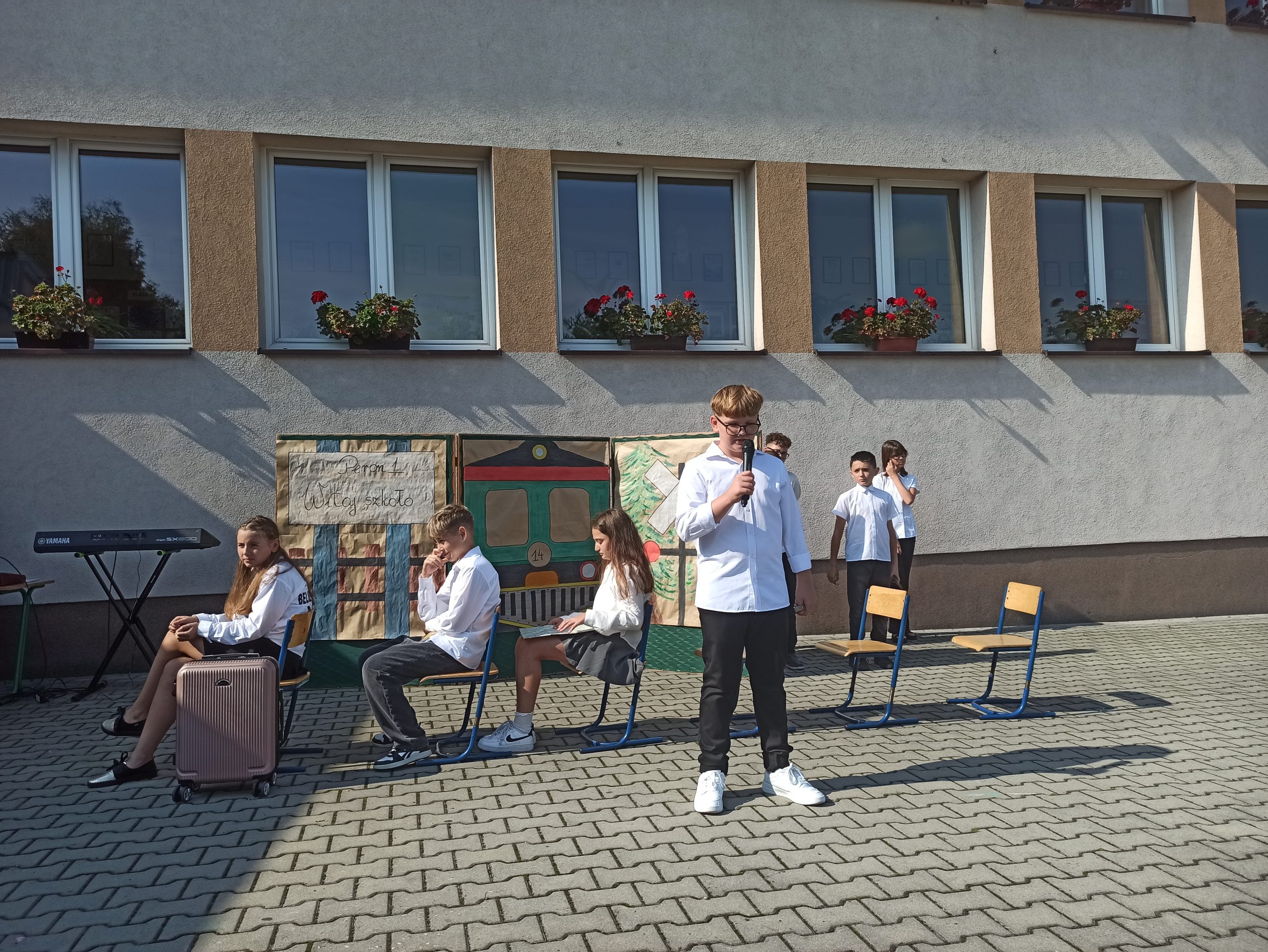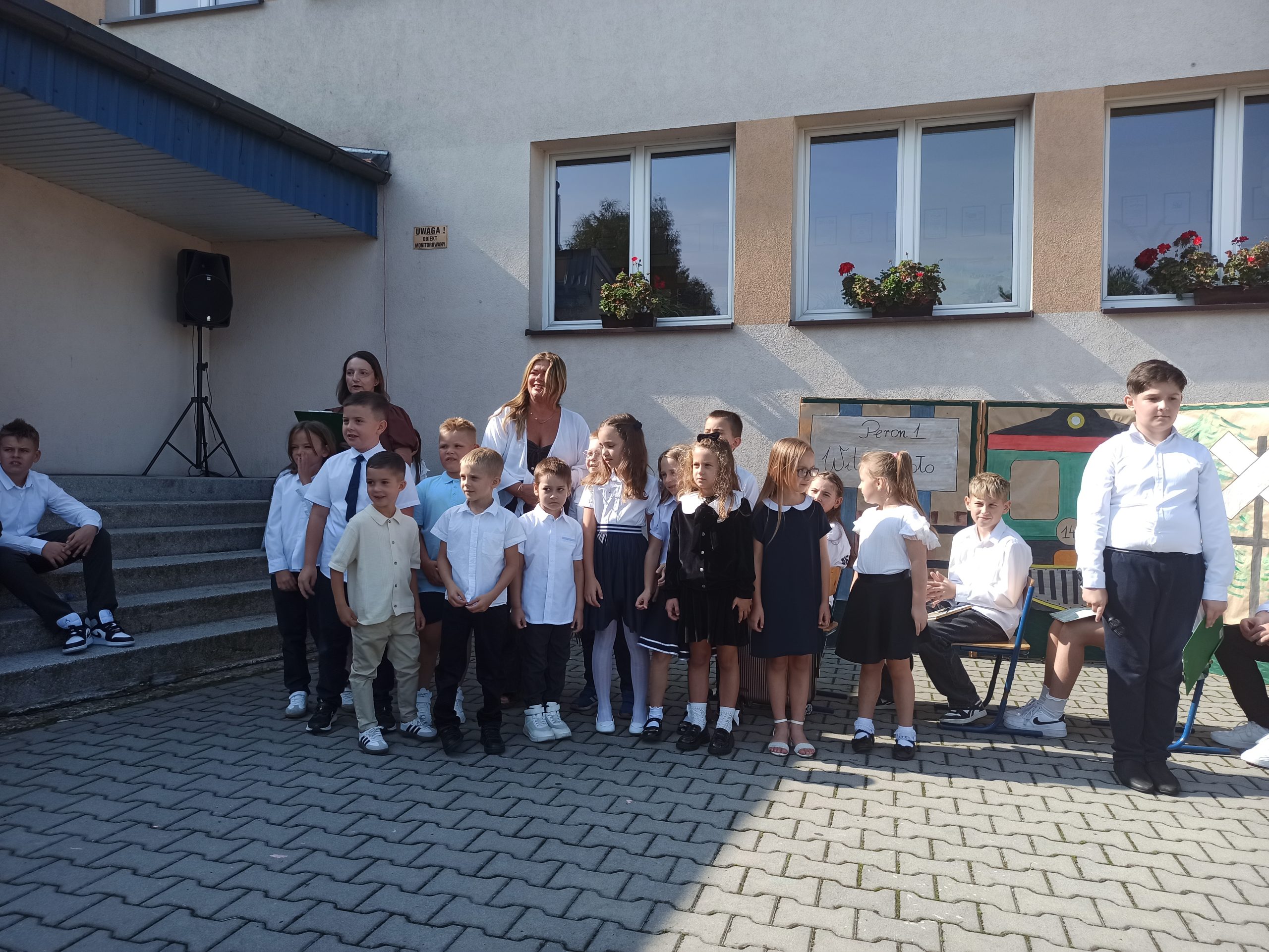 Podczas akademii klasa 6, pod opieką Pani Małgorzaty Liro-Prusak, zaprosiła nas w podróż pociągiem do nowego roku szkolnego. Pani Dyrektor przypomniała o tragicznych wydarzeniach z 1 września 1939 roku — wybuchu II wojny światowej, co nadało tej chwili głębszy sens. Z radością przywitaliśmy również klasę I, której wychowawczynią została Pani Renta Gajdosz.