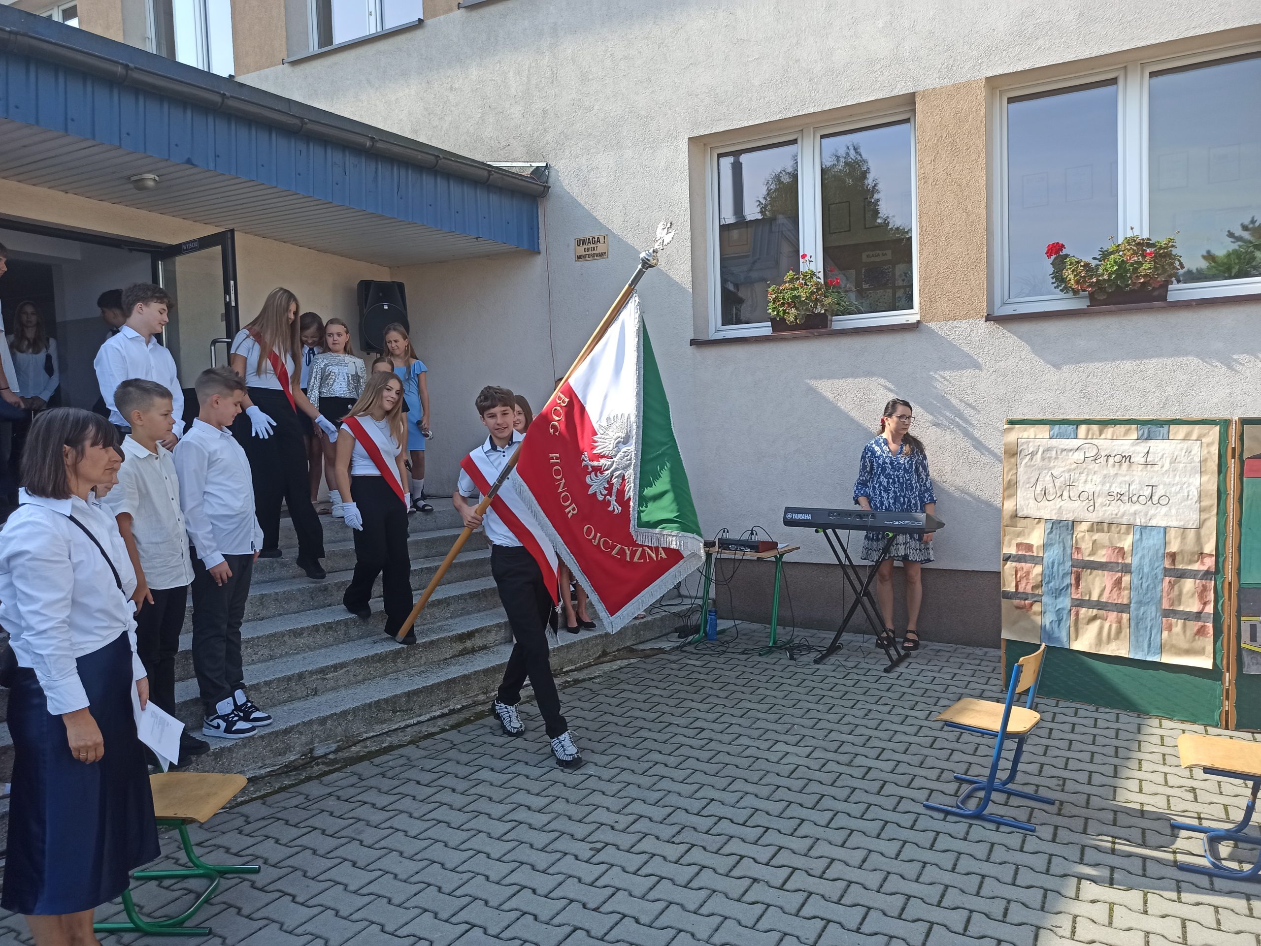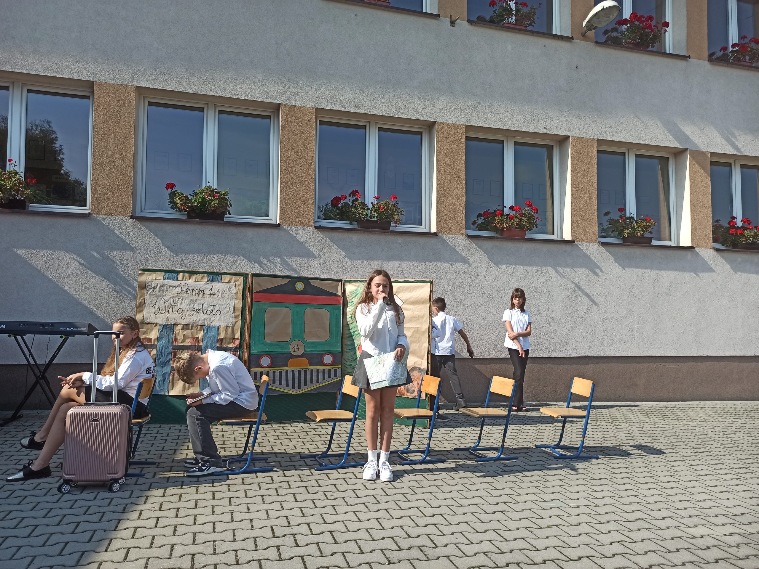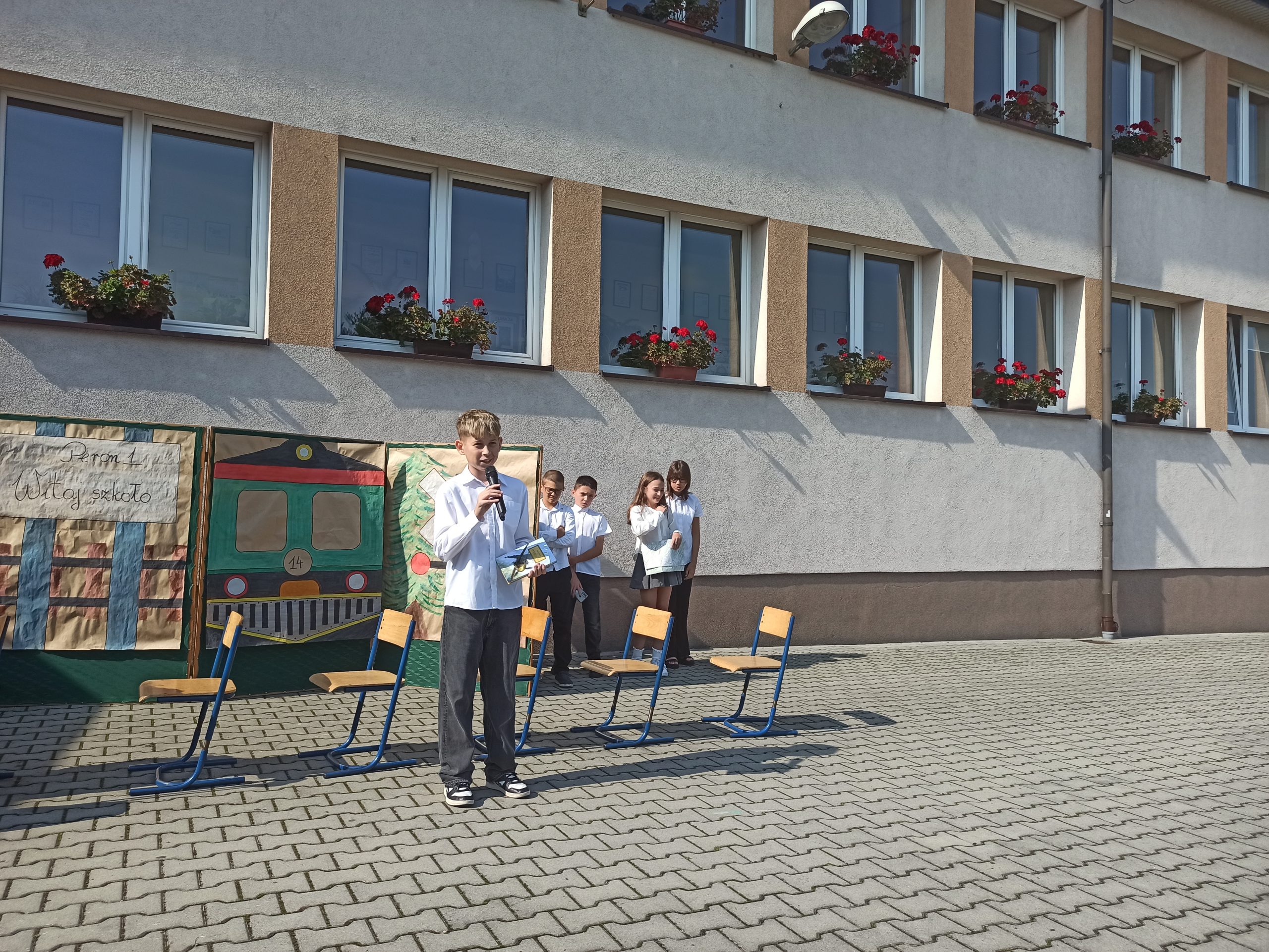 Podczas akademii klasa 6, pod opieką Pani Małgorzaty Liro-Prusak, zaprosiła nas w podróż pociągiem do nowego roku szkolnego. Pani Dyrektor przypomniała o tragicznych wydarzeniach z 1 września 1939 roku — wybuchu II wojny światowej, co nadało tej chwili głębszy sens. Z radością przywitaliśmy również klasę I, której wychowawczynią została Pani Renta Gajdosz.